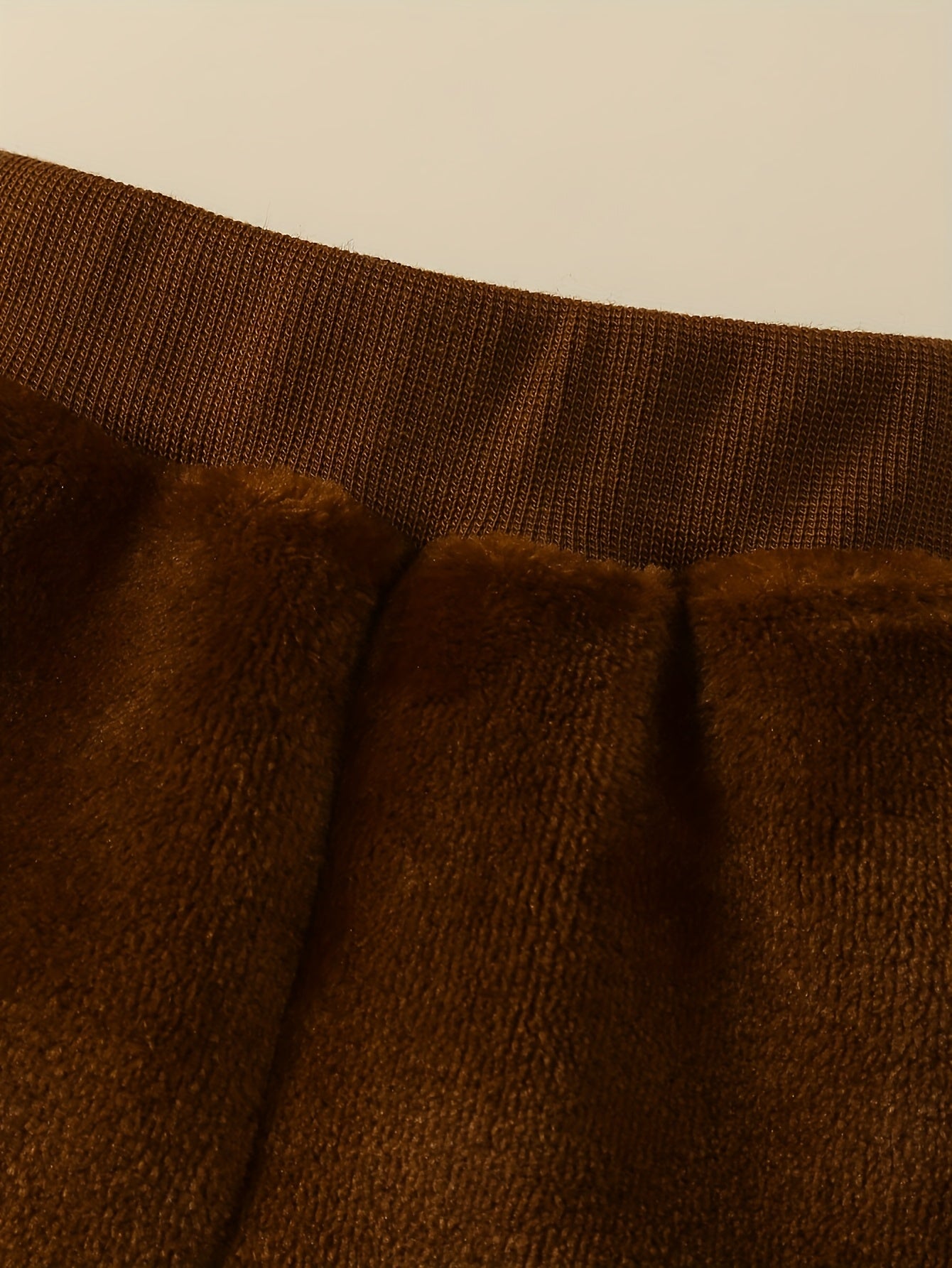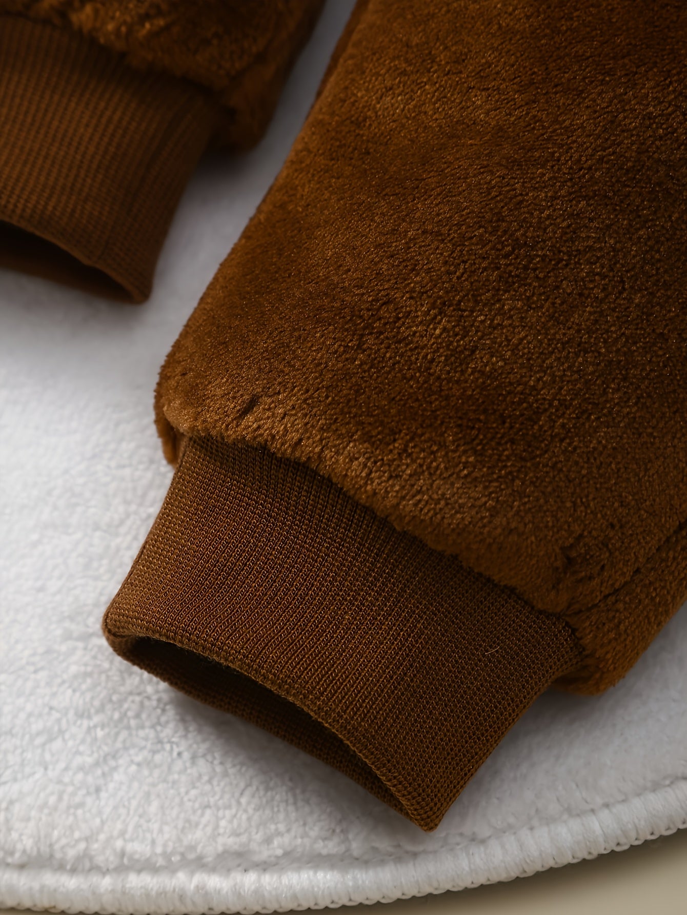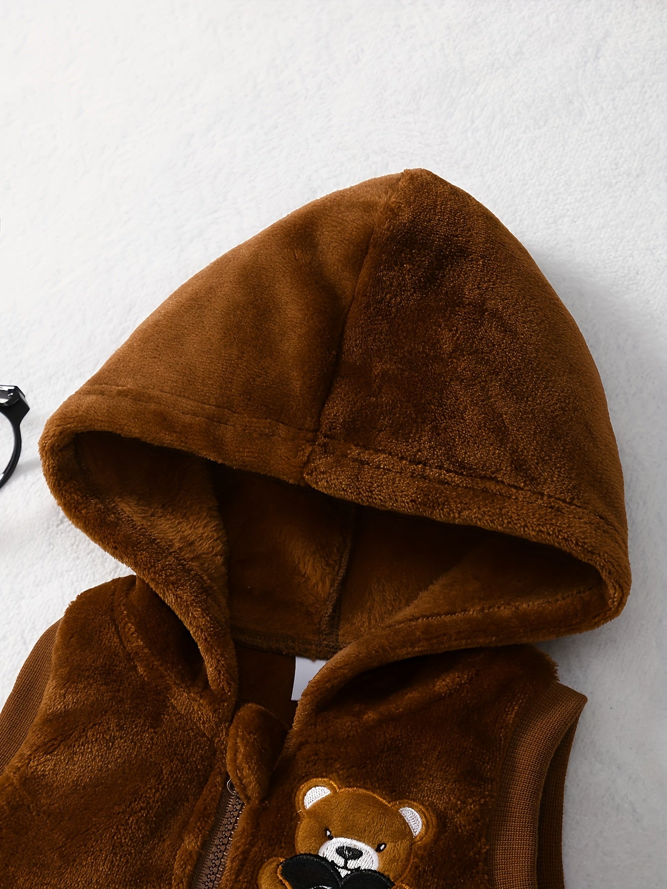 3pcs Baby Boy Winter Outfit Set, Cute Cartoon Bear Embroidery, Warm Reversible Fleece Long Sleeve Sweatshirt, Soft Plush Hooded Zip Vest, Stretchy Warm Pants, Polyester 100%, Crew Neck, Color Block, Knit Fabric, Regular Fit -
